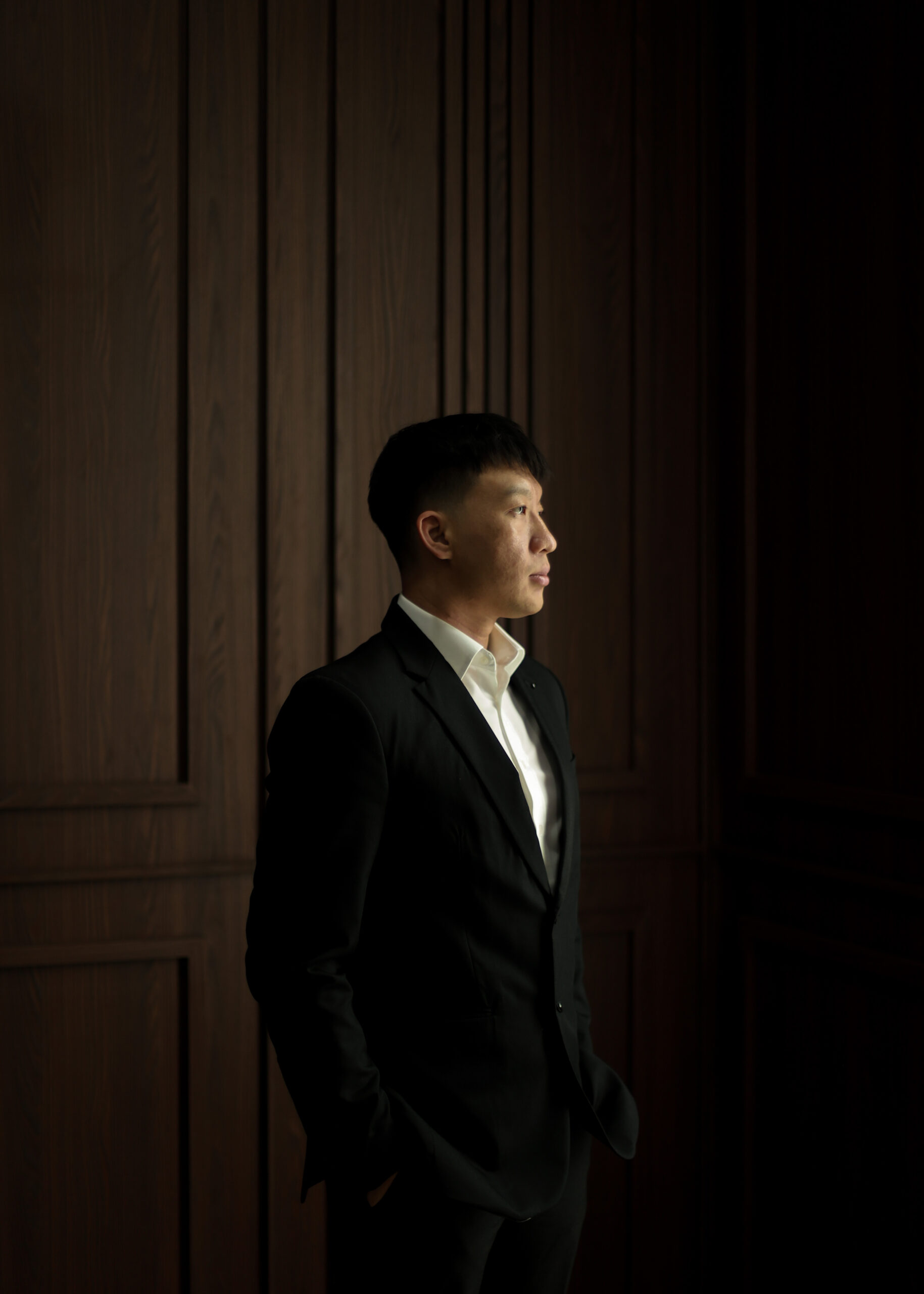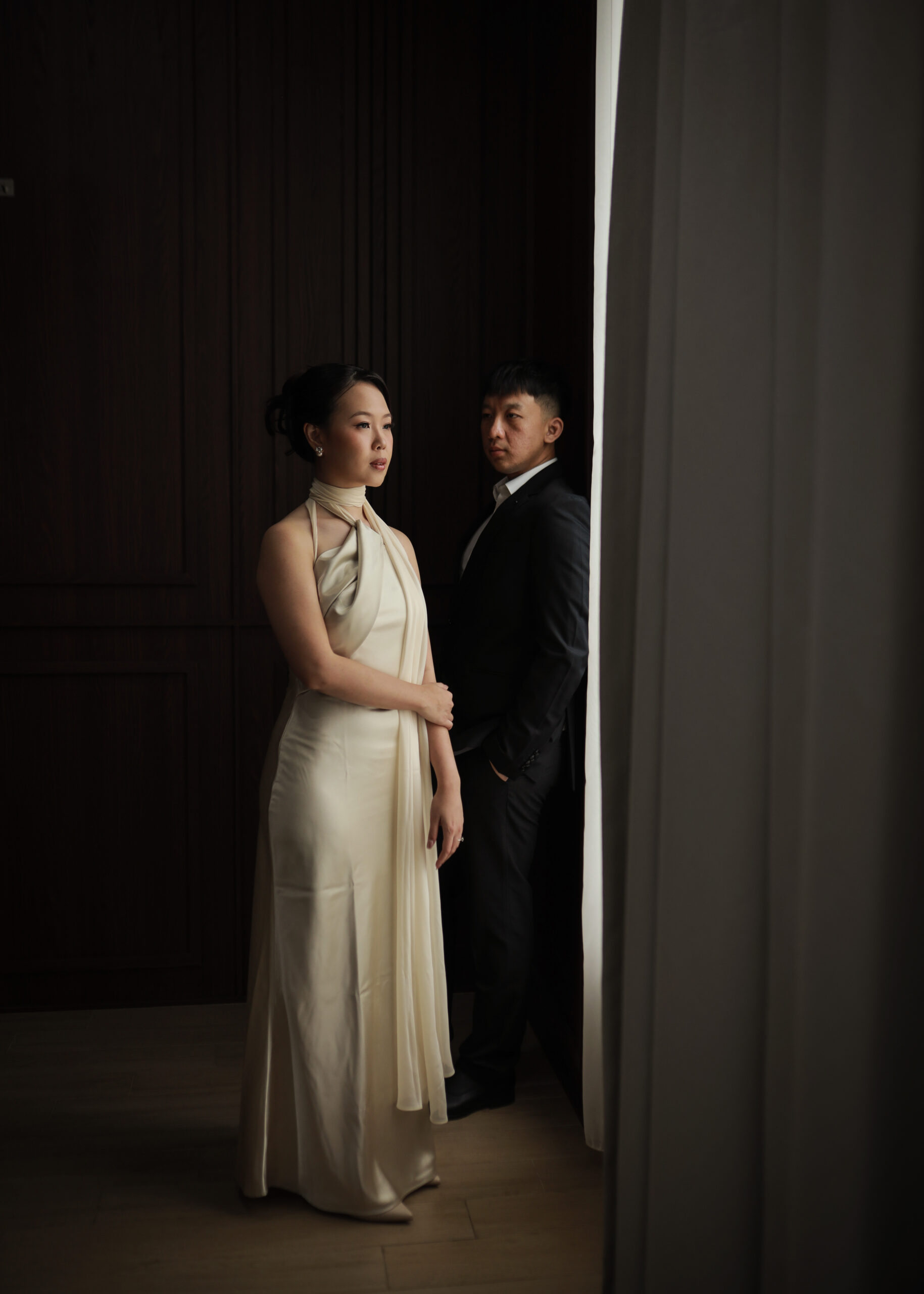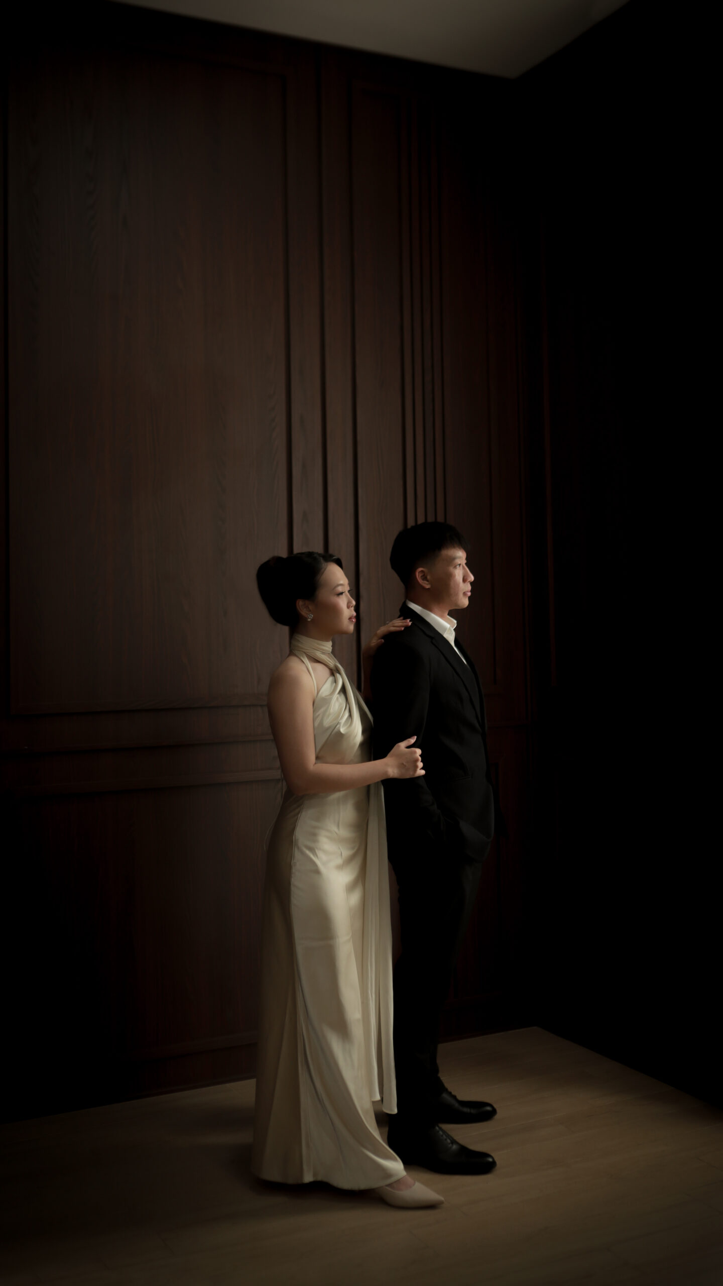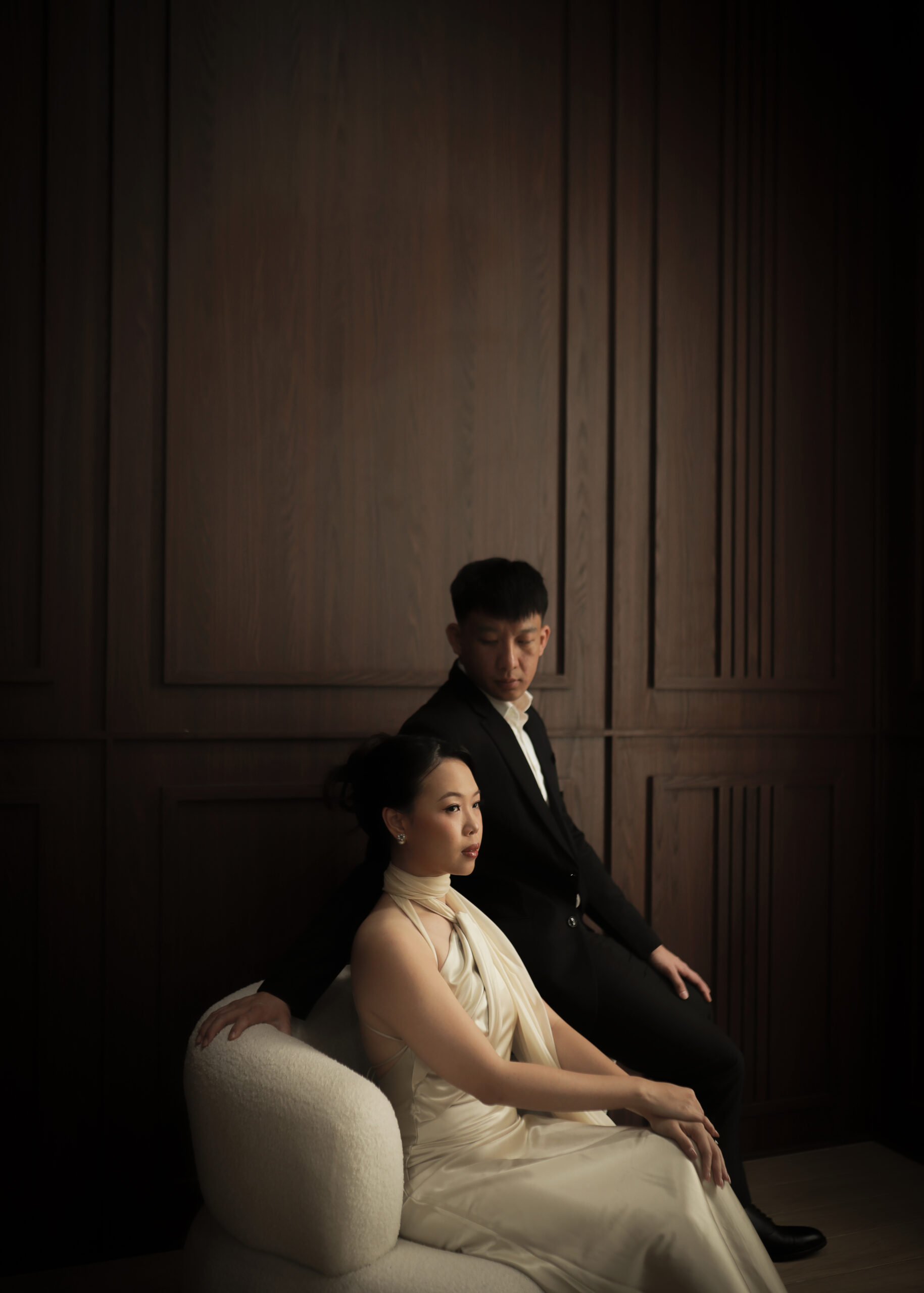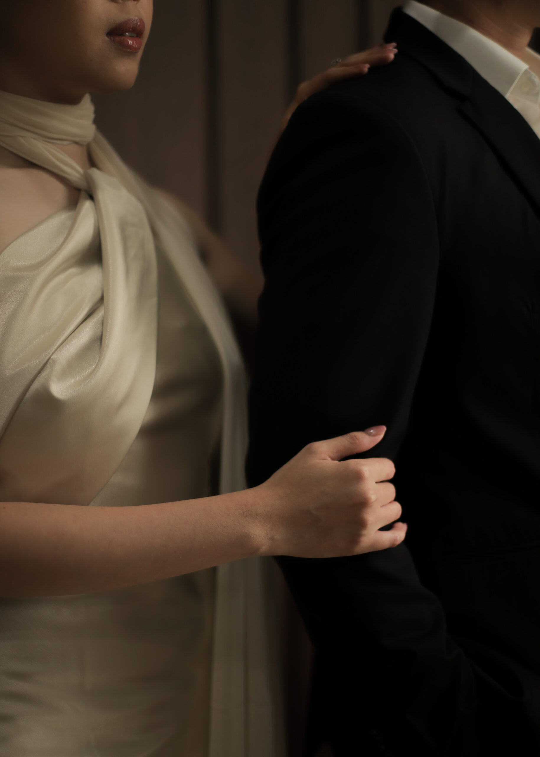 Formal Attire with a classic, timeless aesthetic in dark emerald green, brown, black, burgundy shades – for ladies and black suit for gentlemen.